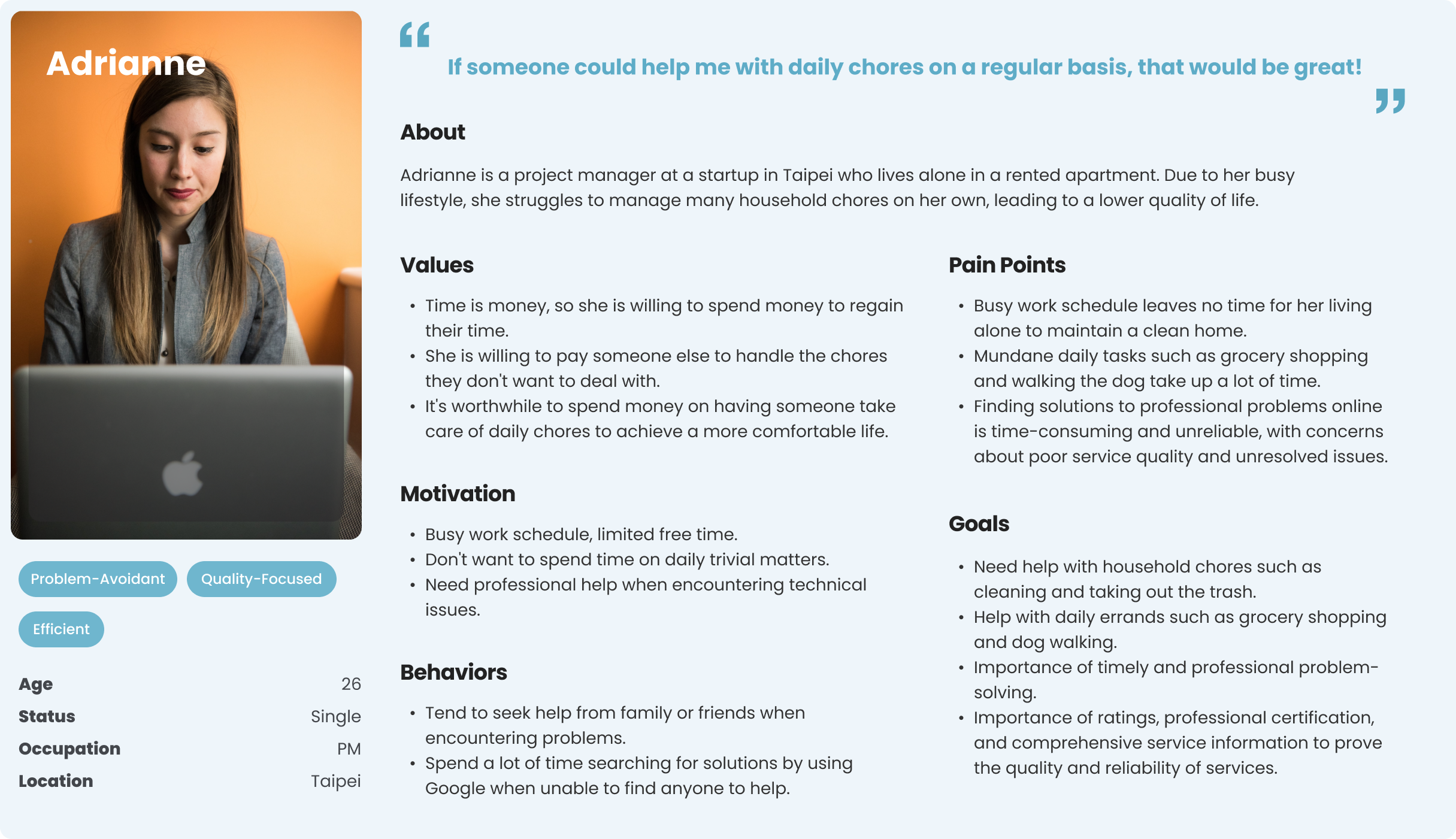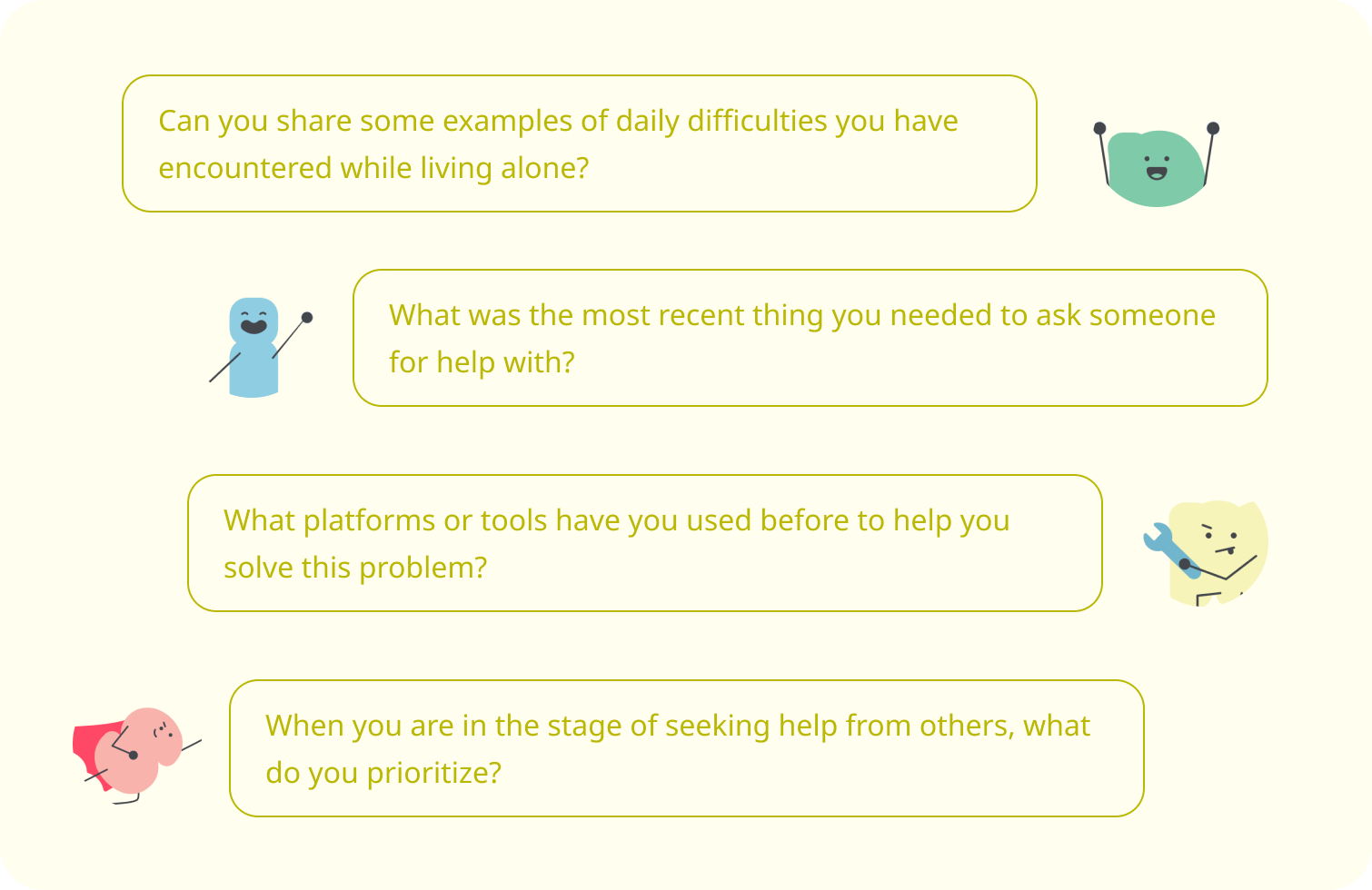 We conducted qualitative interviews to gain deeper insights into the behavior and pain points of people who live alone.