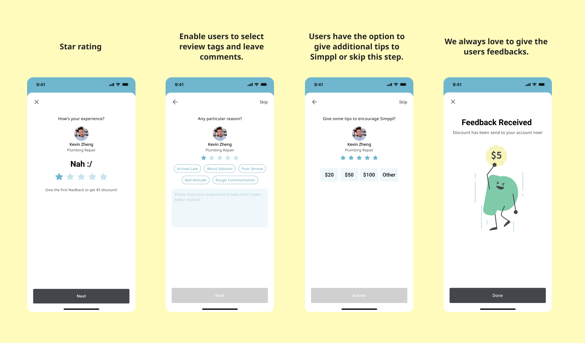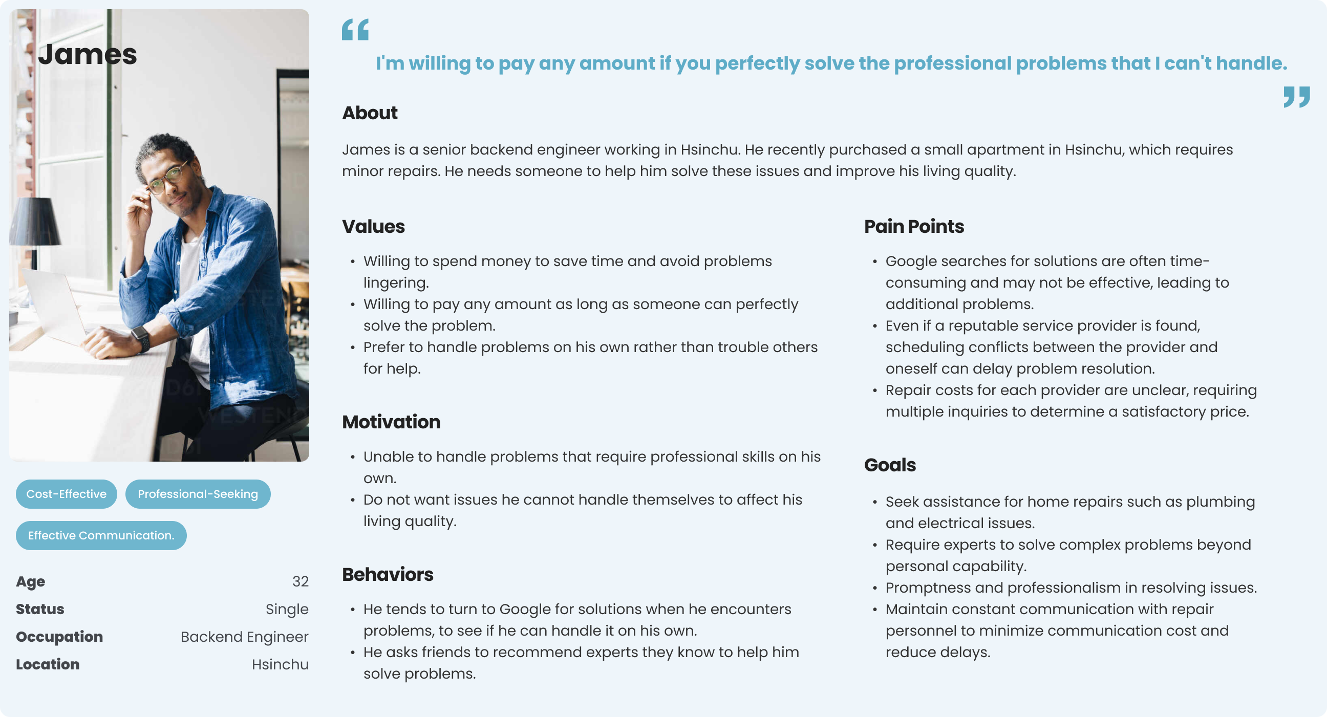 At this point, we are designing from the demand side. In the following stage, we can consider interviewing some repair experts to learn how they assess problems and quote prices, thereby closing the information gap between the supply and demand sides optimizing the entire process.