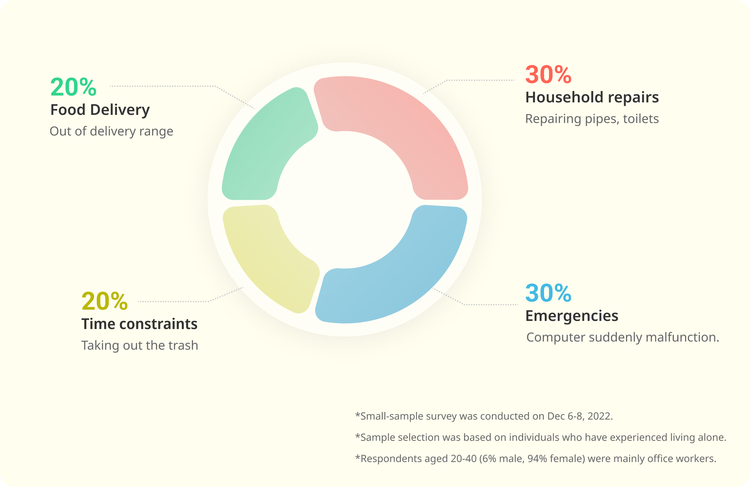 We conducted a small user study using a questionnaire to explore the challenges faced by individuals living alone. Out of 78 completed responses, the survey found that 30% experienced difficulties with household repairs, 30% with emergencies, 20% with food delivery, and 20% with time constraints.